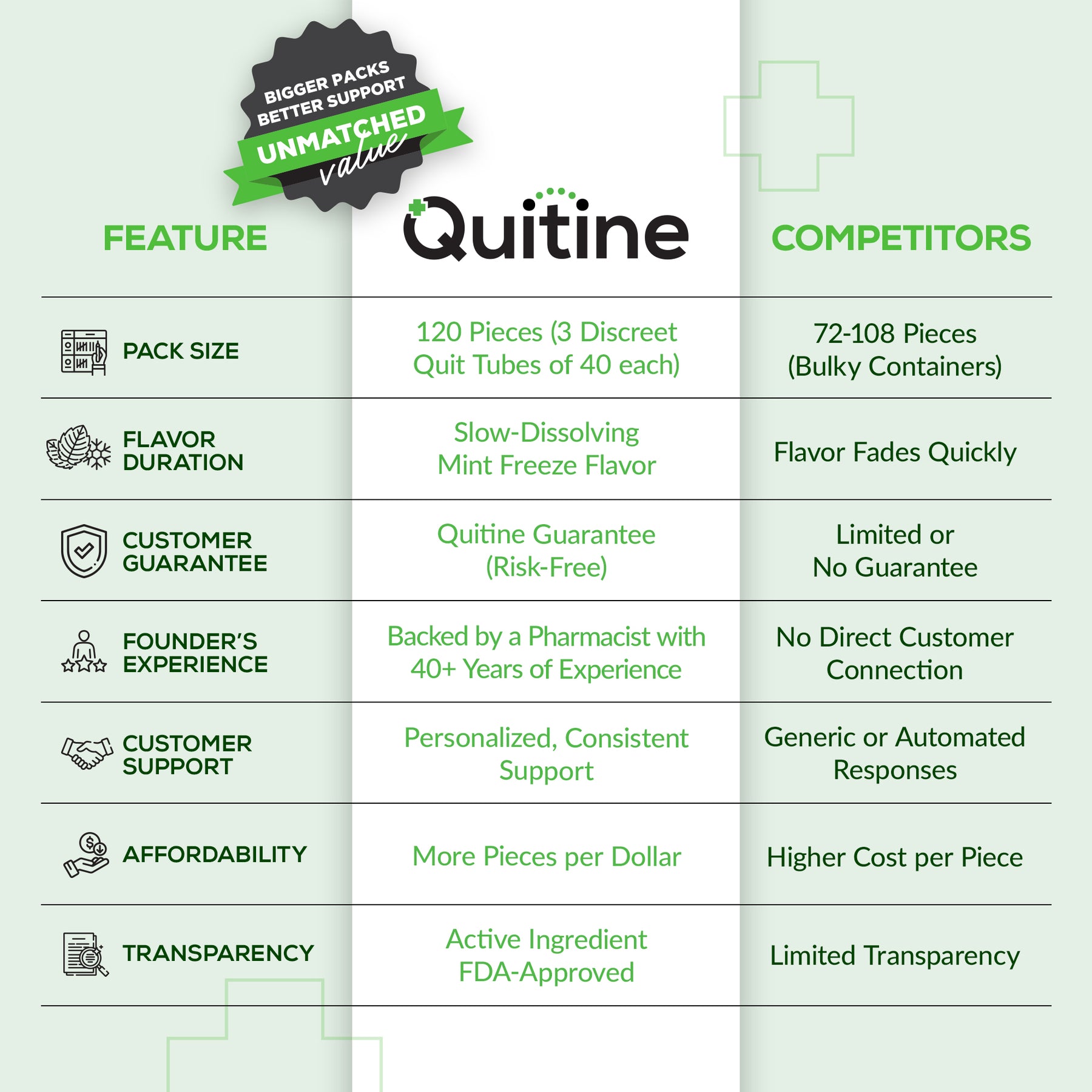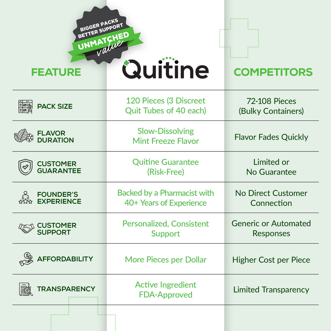 Quitine Nicotine Lozenges 4mg Mint are built for stronger cravings, offering discreet, slow-dissolving support whenever you need it. Simply tuck between your cheek and gum—no chewing or swallowing required. These FDA-approved, sugar-free lozenges use nicotine polacrilex and were developed by a pharmacist with over 40 years of experience. The 120-count box comes in three compact tubes of 40, giving you over 30% savings compared to other brands’ smaller packs.